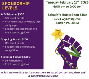 Join us on Mardi Gras for our 3rd Annual Spring Into Hope Fundraiser! Ticket revenue will go toward supporting our Give Hope Outreach Team and those experiencing homelessness in Northeast PA.